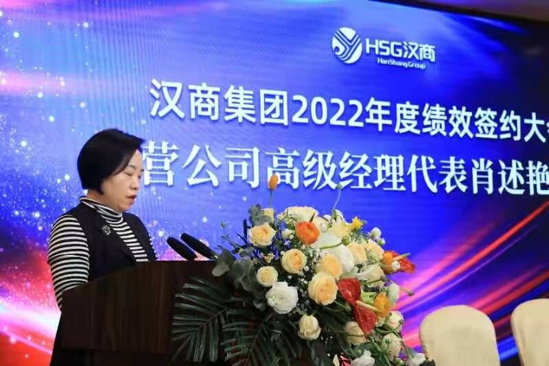 经营公司高级经理代表肖述艳发言。她谈到,过往一年成绩的取得离不开公司领导的支持信任,得益于团队同事们的通力协作。她表示今天签约的是计划,更是一份沉甸甸的责任。新的一年,定会自我加压,迎难而上,努力完成2022年计划目标。